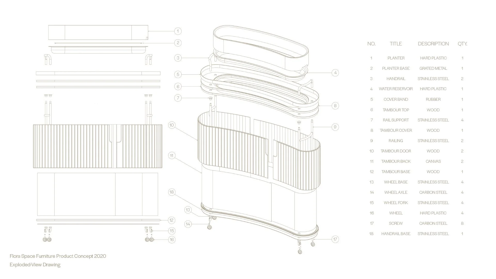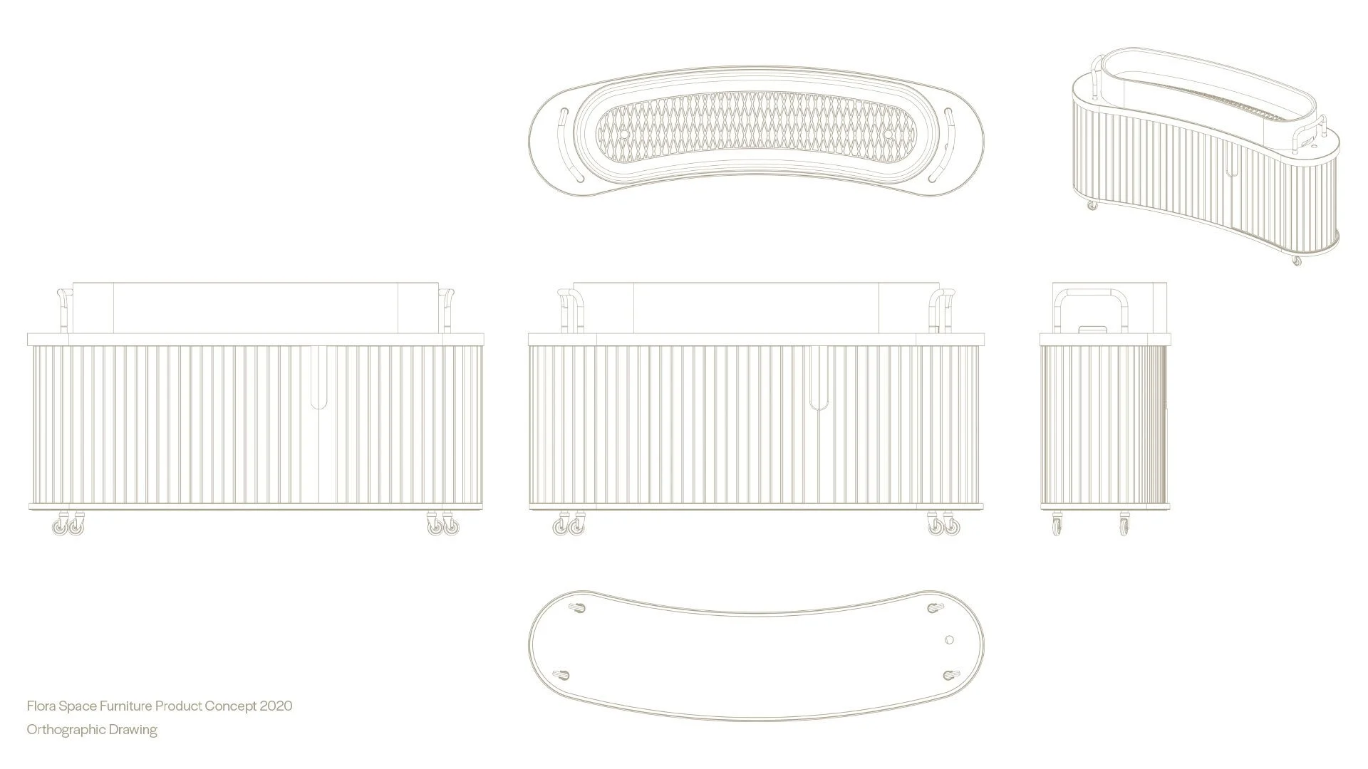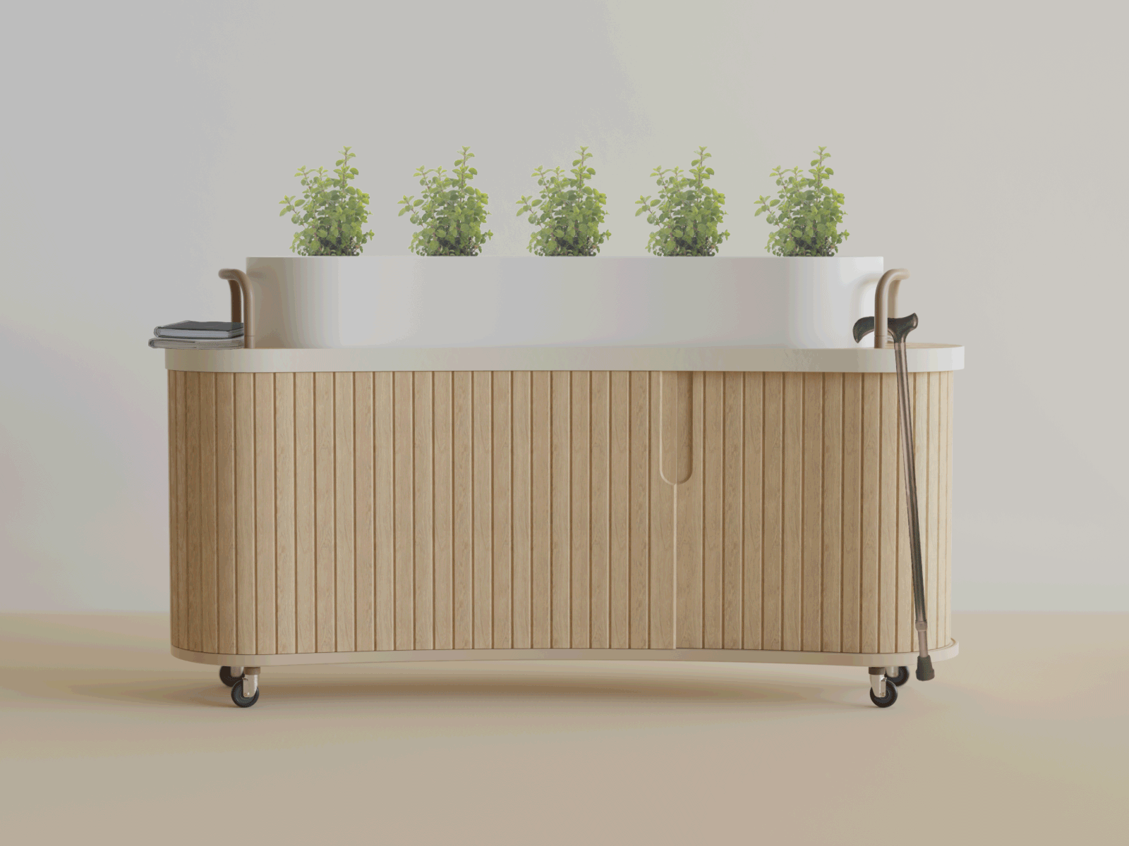 While seeking to enhance user’s experiences at assisted living residences through gardening, Flora Space equally aims to maintain an unobtrusive design as to seamlessly integrate into the users preexisting routines and environment. Tambour doors offer integrated storage and eliminate the need for additional storage space, and its swivel casters enable individuals to garden by conveniently bringing the garden to them or to various communal spaces.