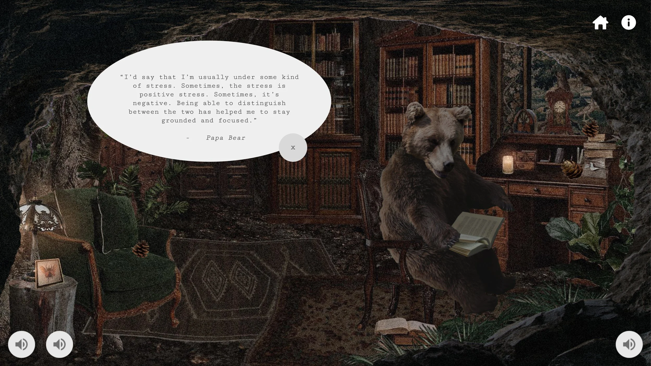 The Burrow is an online roleplaying game in which the player assumes the role of a wandering traveler, and who is invited to rest and spend some time with a family of bears at their home. During this visit, the traveler may explore the bear’s den, chat with the bears, and discover items that hold hidden messages. The objective of this slow-paced game is to engage the individual with reflective prompts and insights that may encourage greater awareness to healthy and sustainable practices of managing one’s physical and mental wellbeing.
