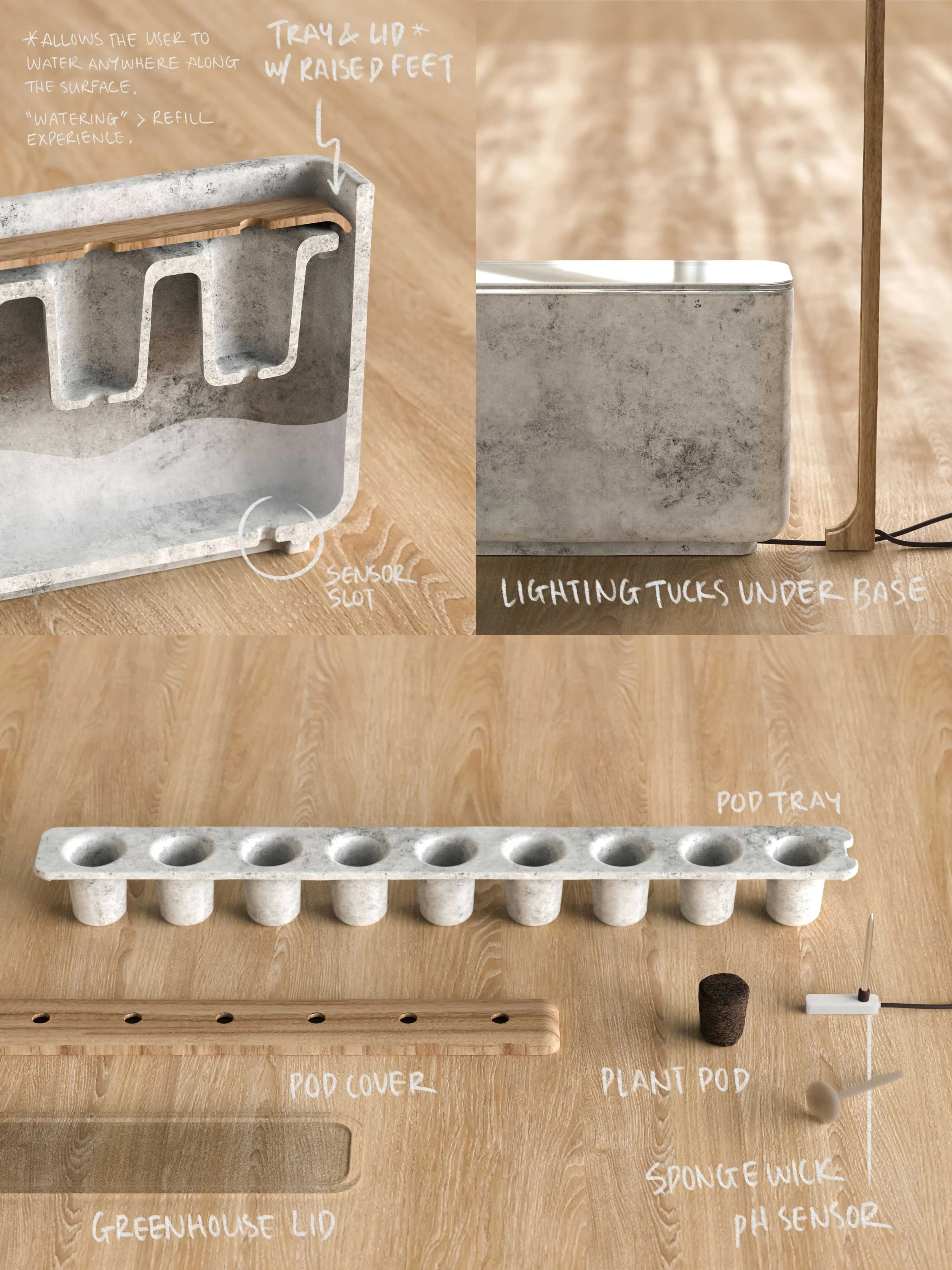 Urban Garden aims to reconsider the ways in which smart gardening products can be manufactured sustainably and with greater efficiency in plant growth, in addition to how access and exposure to a garden can prompt environmental stewardship and a healthier lifestyle among city dwellers. This product was inspired by the Seattle Urban Farm Company’s philosophy to empower Washington state citizens with knowledge and skills to build richer relationships with the abundant nature which surrounds them. Urban Garden aims to reflect SUFCo’s values within its design, while offering a simple yet elegant indoor gardening experience that captures the traditional rituals of gardening.